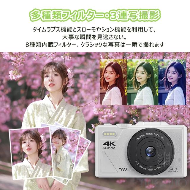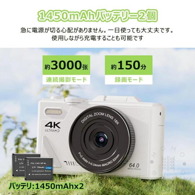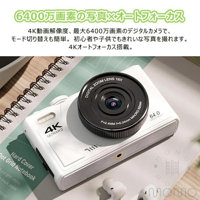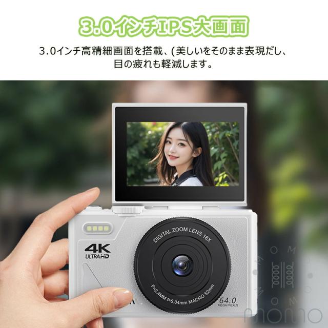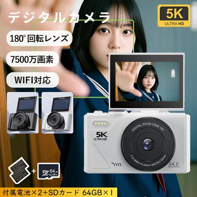 デジタルカメラ 自撮り wifi対応スマホり デジカメ 6400万/7500画素 4K/5K動画撮影 ビデオカメラ カメラ コンパクト 180°回転スクリーン 18倍ズーム AF機能 手ブレ補正 3インチ大画面 ウェブカメラ Vlogカメラ 初心者 花火大会 入学祝い