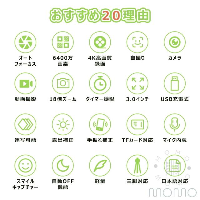 ★手振れ補正「写真」、顔認証、笑顔キャッチャー、連続撮影、美顔、多種類のフィルター、ウェブカメラ機能が搭載されて、豊かな選択で初心者でもカメラ世界の魅力を感じられます。子供の育ちにも、観察力や表現力が鍛えられ、美意識も向上します。