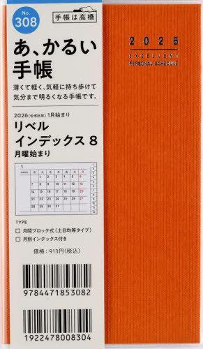 [書籍]/高橋書店 手帳 リベル インデックス 8 (タンジェリン・オレンジ) 手帳判 マンスリー No.308 2026年 1月始まり 月曜始まり/高橋書店/NEOBK-3121805