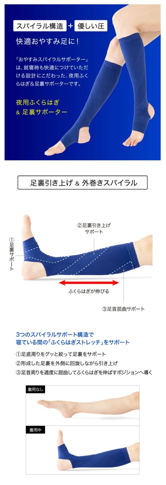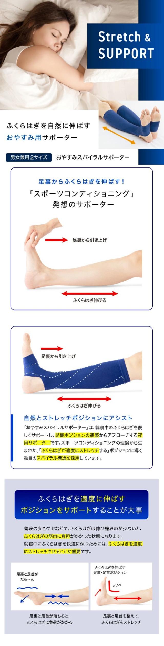 「おやすみスパイラルサポーター」は、スポーツコンディショニングの発想から生まれたふくらはぎをストレッチさせるサポーターです。