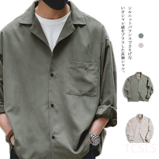 【送料無料】シャツ メンズ 長袖 オープンカラーシャツ 長袖 開襟シャツ シャツジャケット アウター コート 羽織 ドロップショルダー カジュアルシャツ スエード調 無地 おしゃれ 薄手
