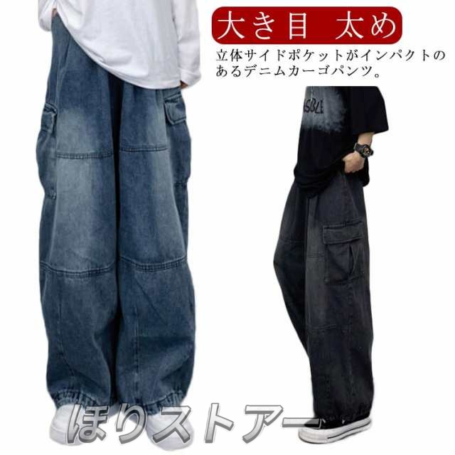 ワイドデニムカーゴパンツ デニム カーゴパンツ レディース メンズ 大きいサイズ ゆったり ワイドパンツ デニムパンツ バギーパンツ ジーパン サイドポケット ルーズフィット 大き目 太め ジーンズ ダンス衣装 ヒップホップ ストリート系 B系 ブラック ブルー