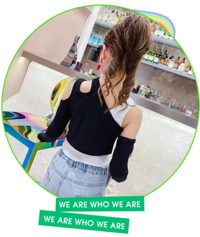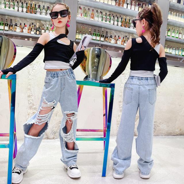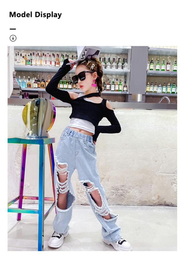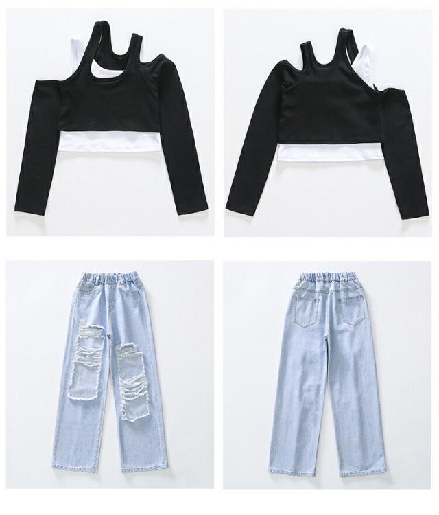 デニムパンツ キッズ ダンス セットアップ へそ出し 衣装 女の子 ダンスウエア 社交ダンス チームウエア 袖カバー チアガール パンツ HIOPOP 発表会 韓国 ヒ JAZZ