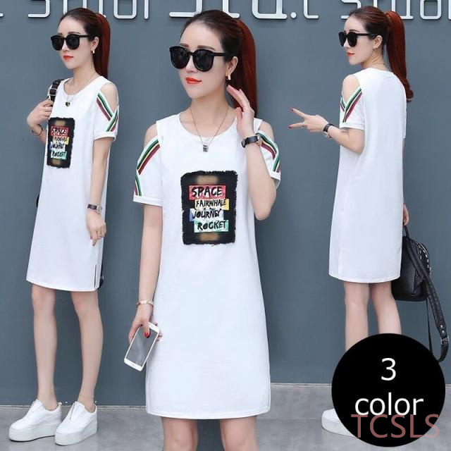 ミニワンピース Tシャツワンピ チュニック レディース デザインワンピ 半袖 肩だし 肩あき オープンショルダー カジュアル 英字ロゴ 肩開き ロング