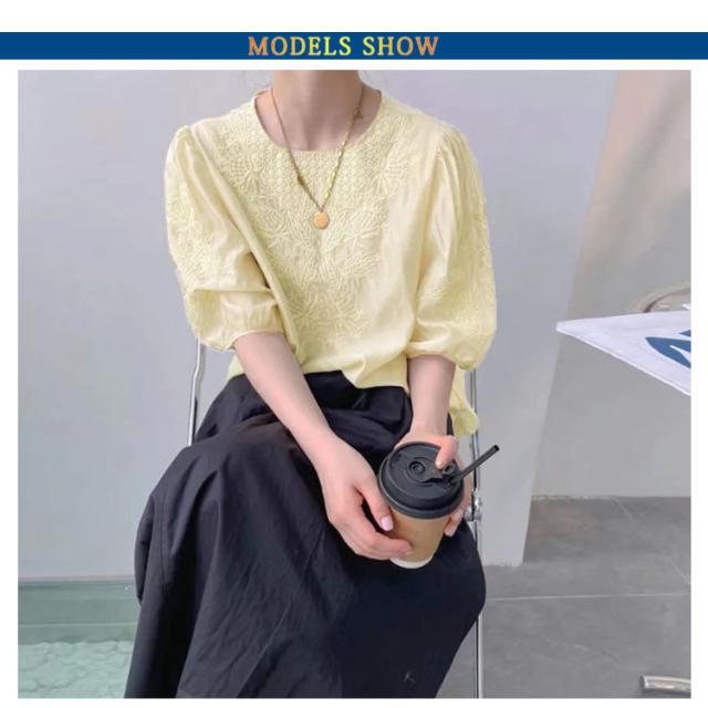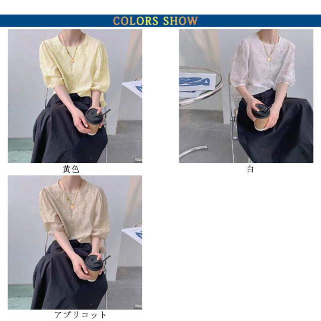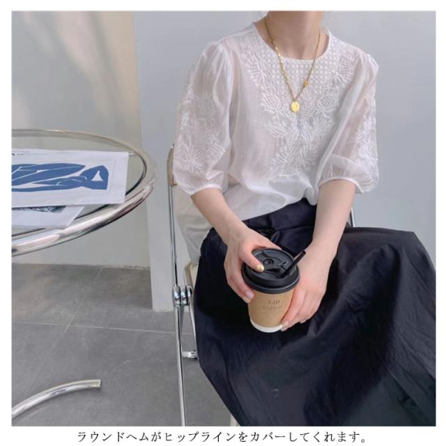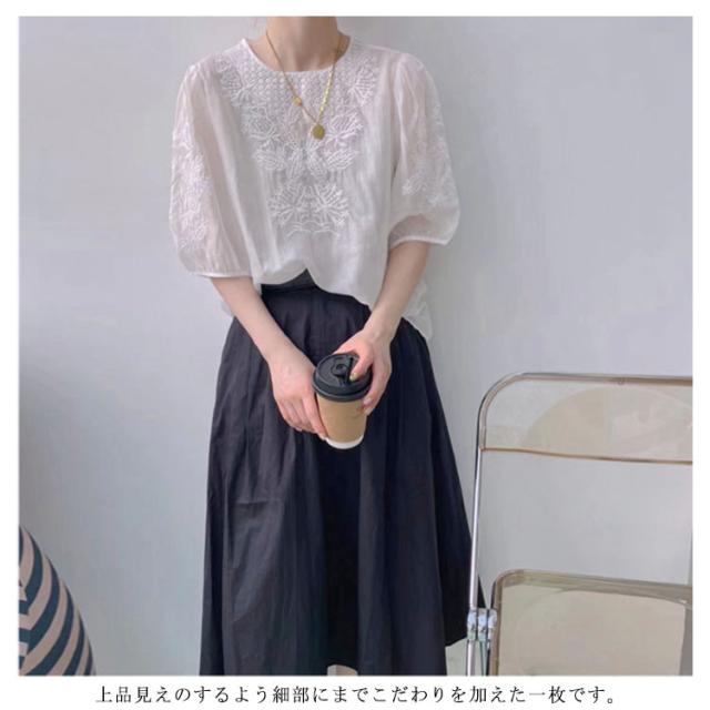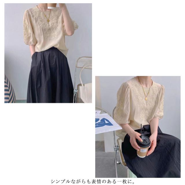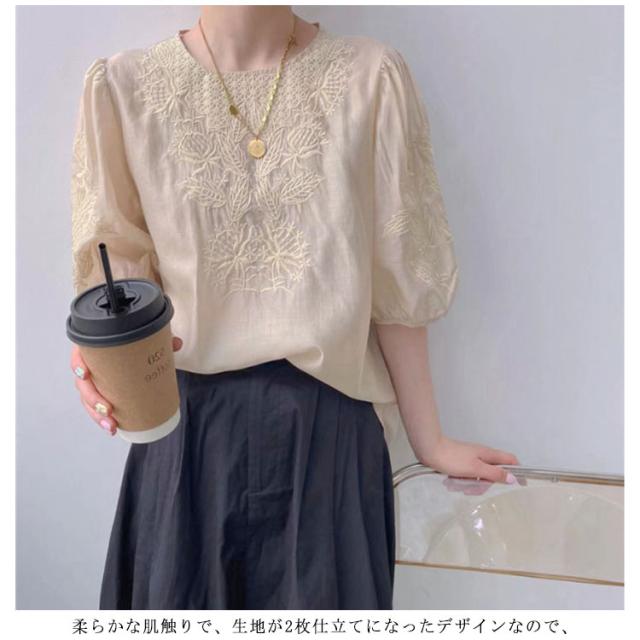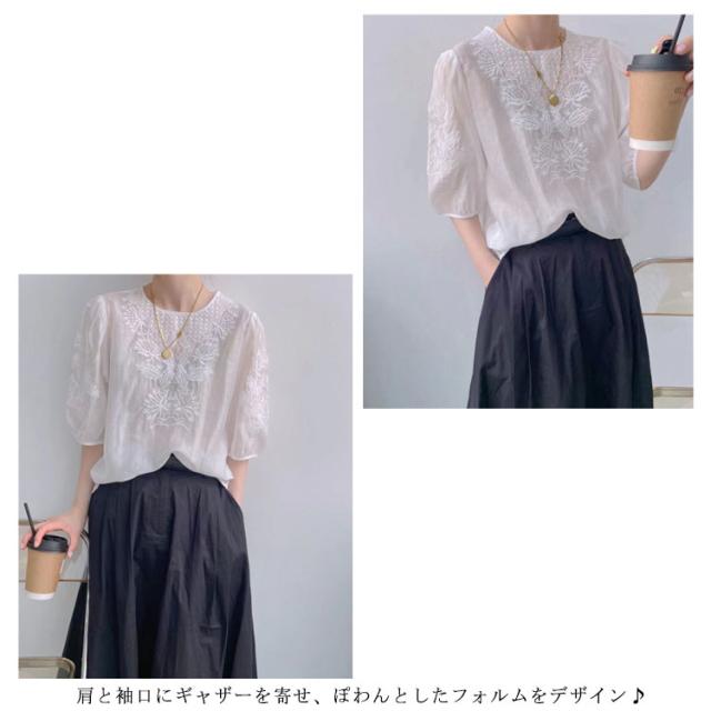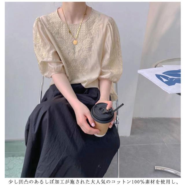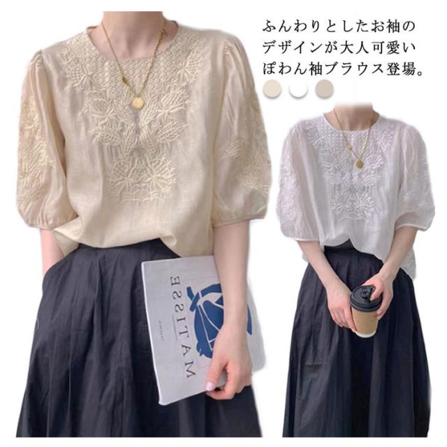 ぽわん袖 ブラウス レディース トップス 春 夏 半袖 ボリューム袖 綿 コットン ふんわり 刺繍 レース 刺繍ブラウス ゆったり