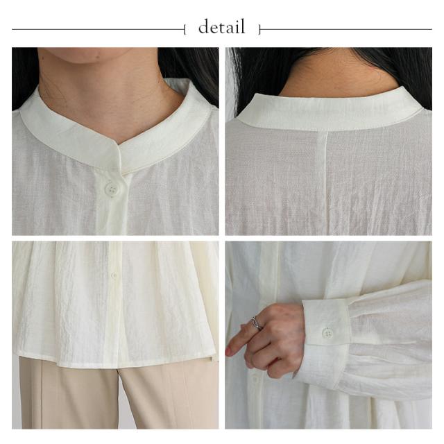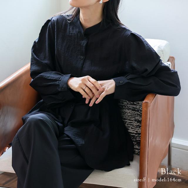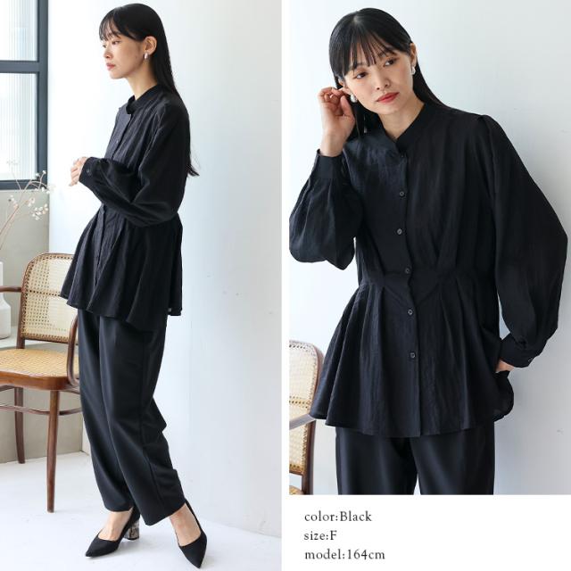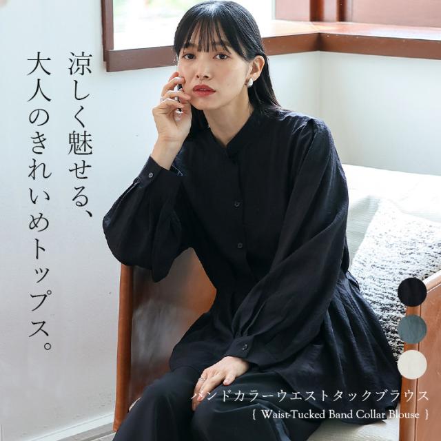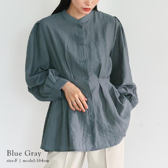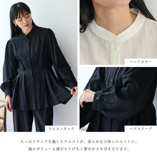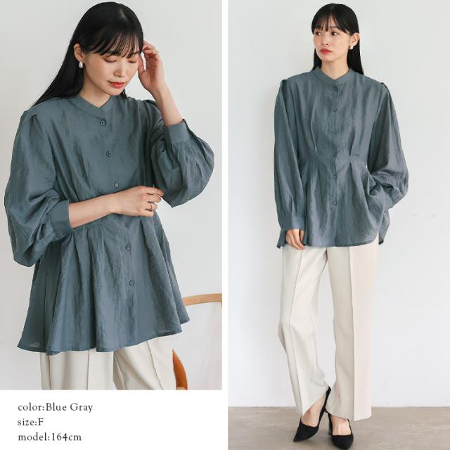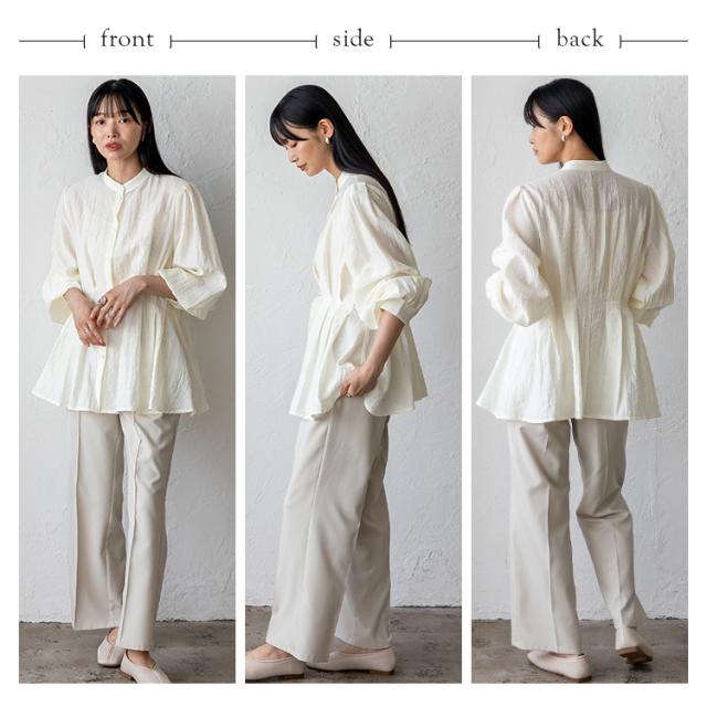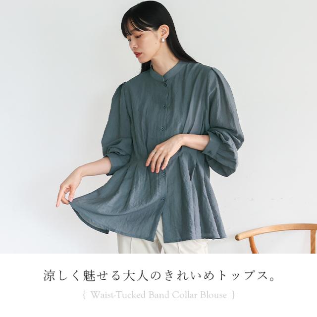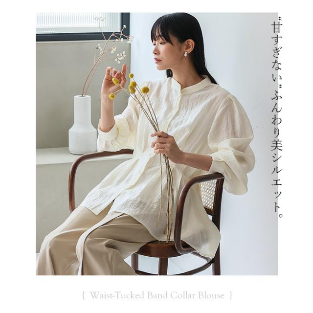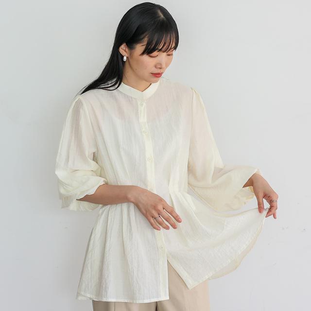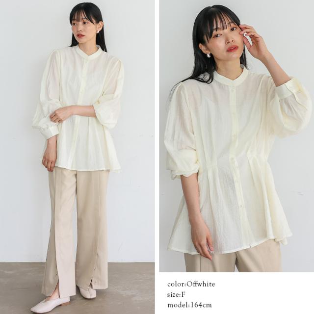 ブラウス レディース 長袖 薄手 シャツ ギャザーブラウス シワ加工 シースルー トップス 透け感 シアー素材 おしゃれ オフィス ドライタッチ 華奢見え おしゃれ 大人可愛い 着回し 上品 バンドカラー ウエストタック nrc-0008 【メール便】【No Rule No Line】
