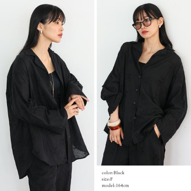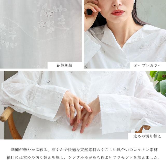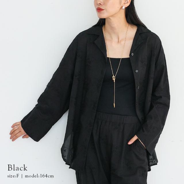 【セットアップ可】シャツ 長袖 ブラウス レディース コットンレース オープンカラー 花柄 刺繍 レース シアーシャツ 綿 コットン 天然素材 上品 きれいめ 大人 体型カバー 透け感 シアー 黒 白 ホワイト カジュアル 【メール便】 nrc-0011【No Rule No Line】