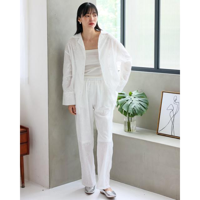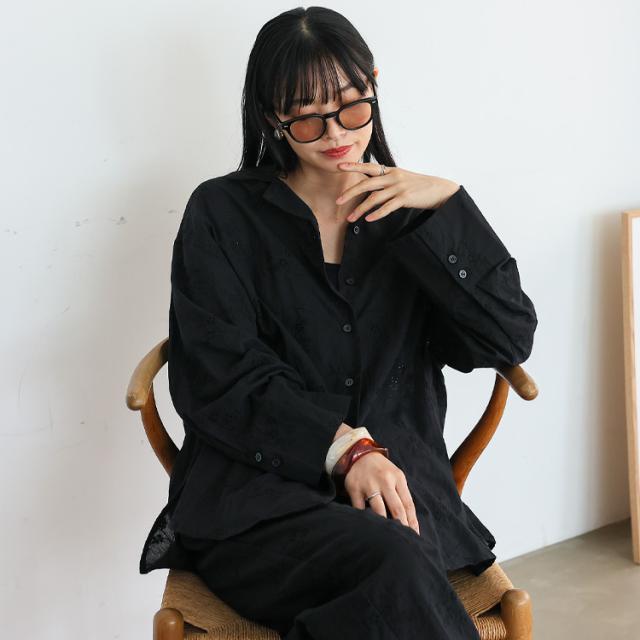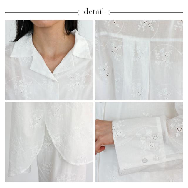 繊細な花柄刺繍が目を惹く、ナチュラルな風合いのコットンレースシャツ。