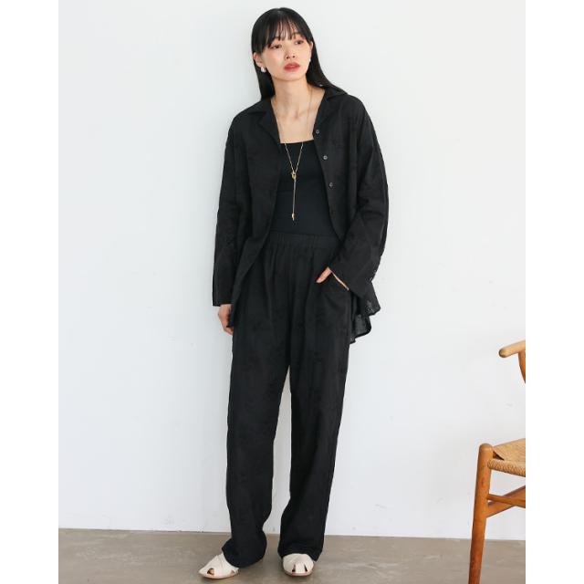同素材のパンツと合わせて、程よく抜け感のあるセットアップスタイルに。