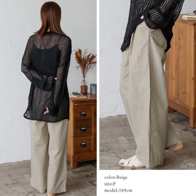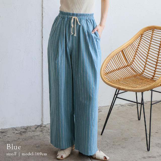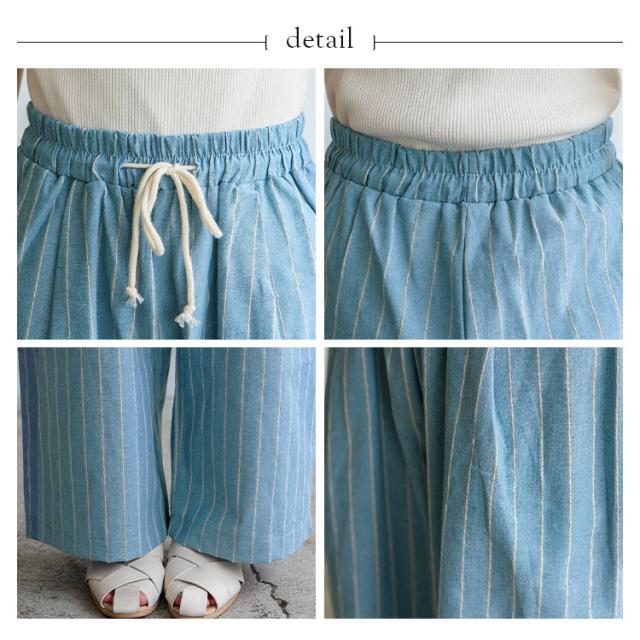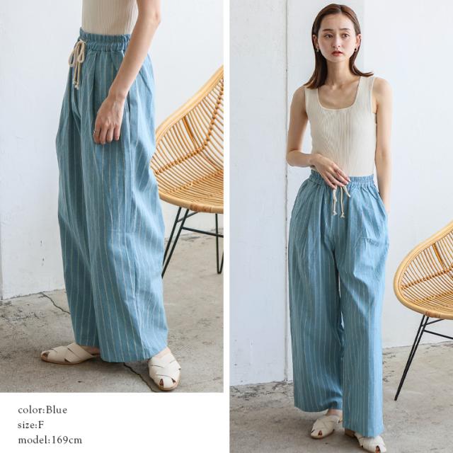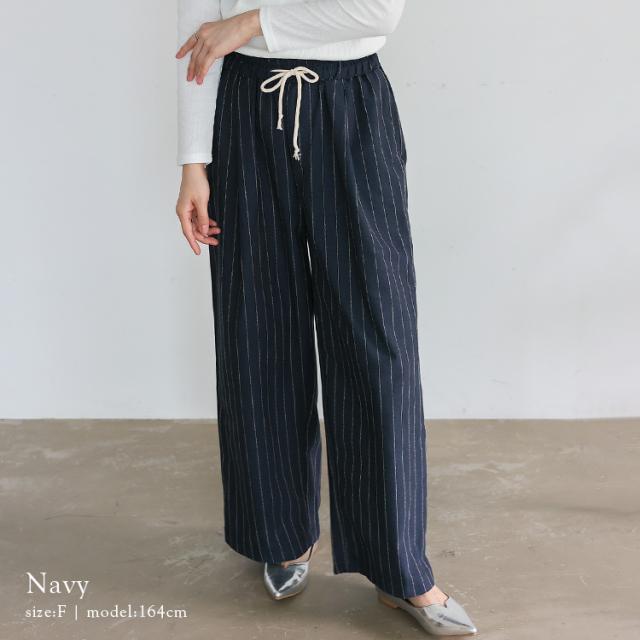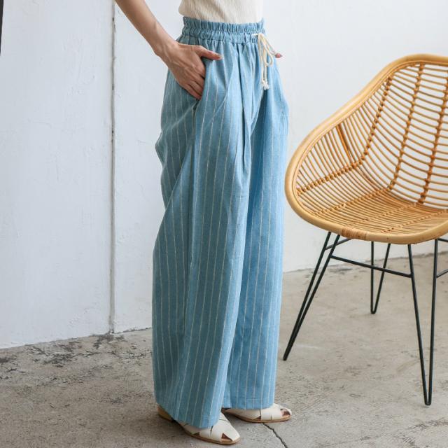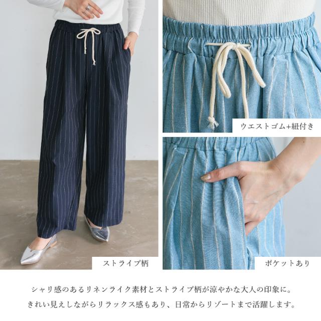 パンツ レディース 夏 涼しい リネン風 ストライプ ワイド 大人 ストレート ワイドパンツ ウエストゴム 紐付き 両サイドポケット ナチュラル ゆったり イージーパンツ ルームウェア ボトムス 太め ゆったり 体型カバー おしゃれ 【メール便】 vkkc-0556