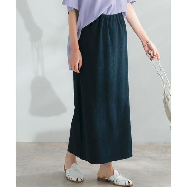 タオルのような柔らかな肌触りの、パイル生地を使用したスカート。伸縮性のある素材感×ウエストゴム仕様のため、リラクシーな着心地を実現します。裾にはバックスリットを施すことで、足さばきの良さも魅力ポイントに◎女性らしいストレートシルエットが、幅広いトップスと相性抜群です。ニュアンスカラーが女性らしいMIX BEIGE・MIX BLUEに加え、ベーシックなNAVYの3色展開でご用意。