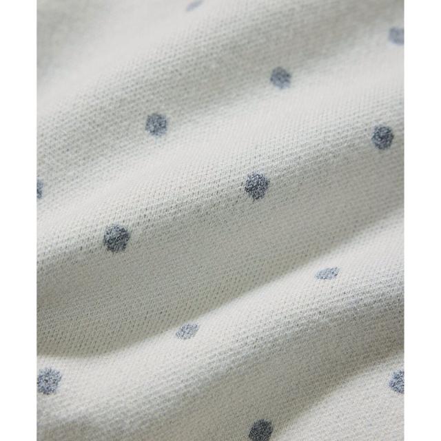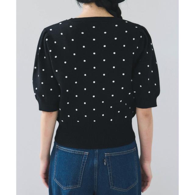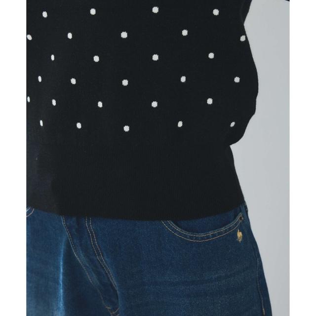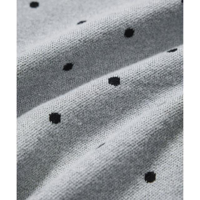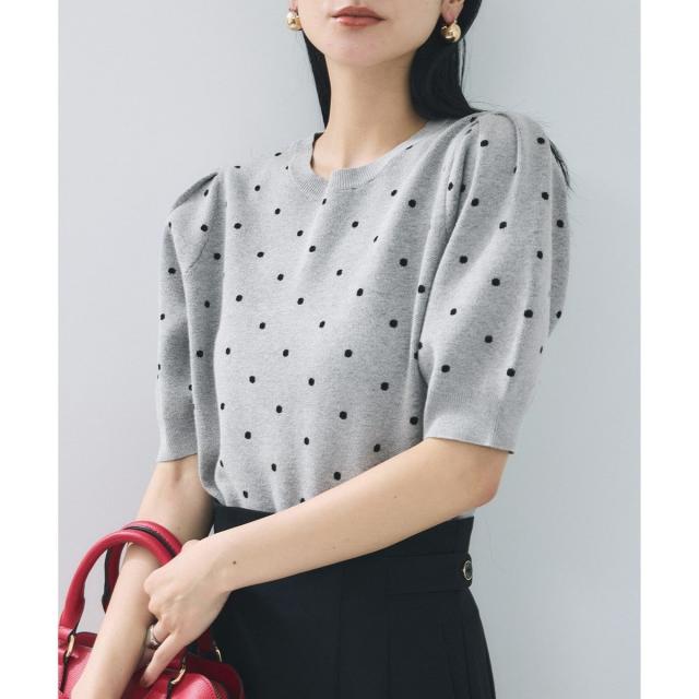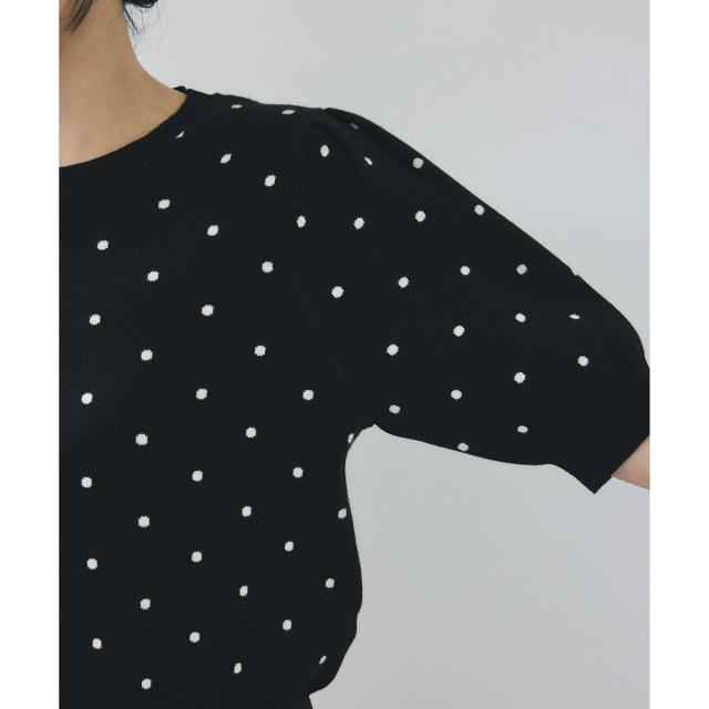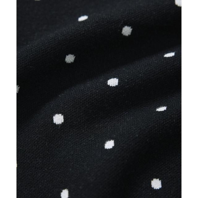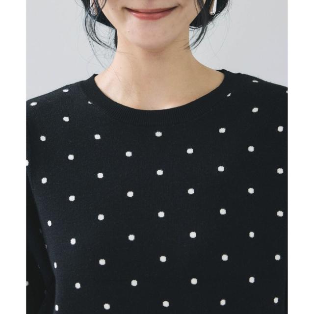 襟ぐりは合わせやすい丸首なので華奢なネックレスなども合わせやすいです。シーンを選ばないドット柄なので、キレイ目にもカジュアルダウンも両方使える万能さが◎。