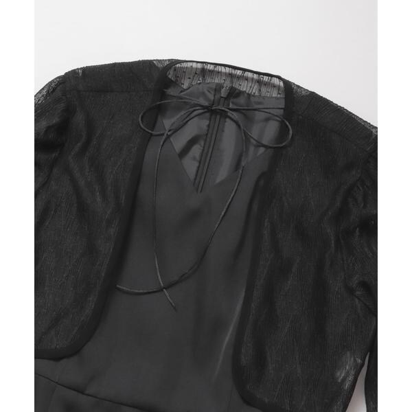 ドレスに合う絶妙な着丈感のボレロは、ドット柄の細やかなランダムプリーツ素材。ワンピースは表情のあるサテンで、上品な光沢感が特徴です。スカート部分はヒップラインが綺麗に見える、コクーンシルエット。ノースリーブですが、しっかりと肩が隠れる綺麗な形なので、ボレロなしで1枚でも着用可能です。スパゲティコードを使用した襟ぐりのリボンもデザインポイントに◎