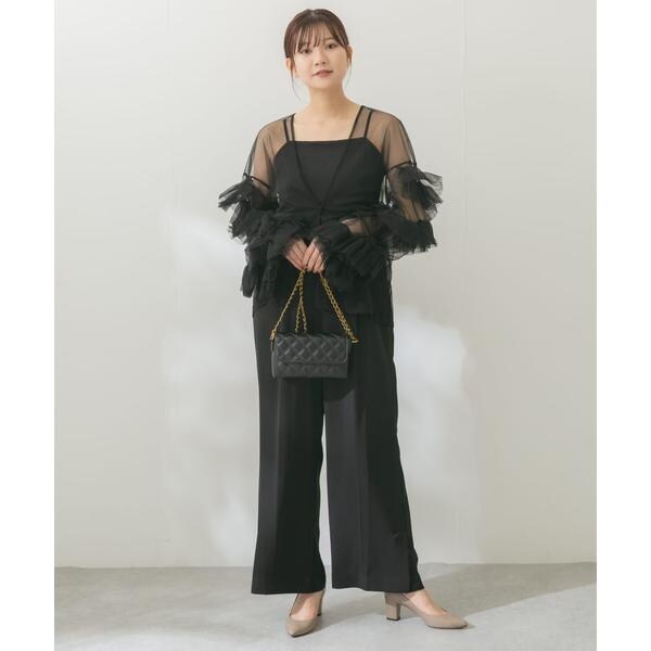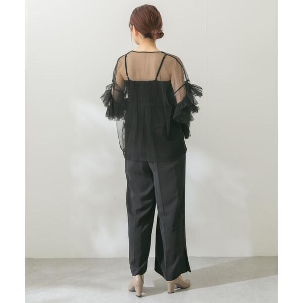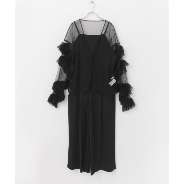 目を惹くチュールブラウス&オールインワンがセットになった華やぎアイテム。シンプルなオールインワンと、ボリューム感たっぷりのチュールブラウスがより一層バランス良く引き立ちます。オールインワンは胸下位置に切り替えを施すことで、脚長効果も◎それぞれ単体使いも可能で、デイリースタイルにも馴染んでくれる一品です。チュールブラウスは、カットソーとレイヤードした旬な着こなしもお勧め。