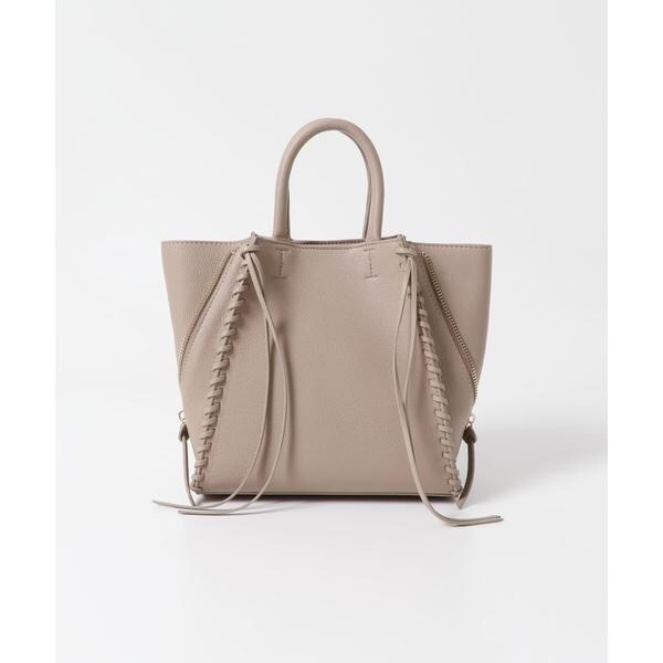 サイドのジップデザインがアクセントのトートバッグ。コンパクトなサイズ感ながらもしっかりとした底と内ポケットが付いており、収納力も抜群。ショルダーベルトがついており、斜め掛け使いできる点も嬉しい◎リボンを巻いたような淵のディテールも魅力ポイントです。上品さとカジュアルさを兼ね備えたデザインで、オン・オフ使い回せること間違いなしのアイテムです。