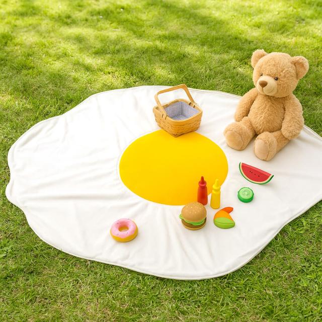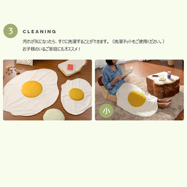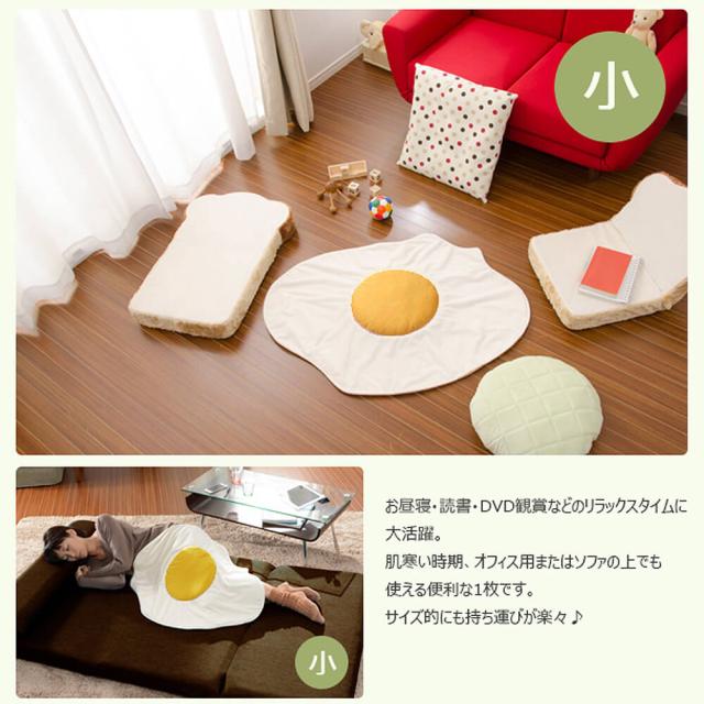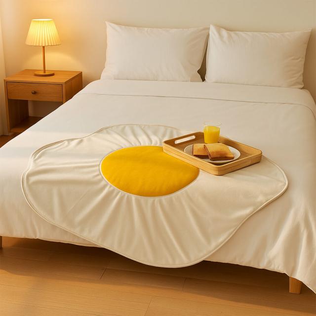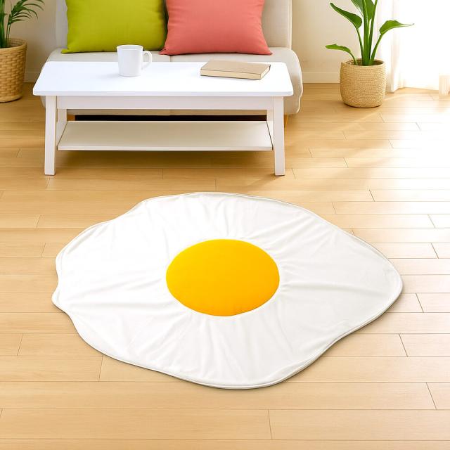 お部屋にほっこり癒しをプラスする、目玉焼きデザインのかわいいブランケットが登場!黄色い「黄身」部分はふっくら立体的で、見た目も手ざわりもやさしい仕上がり。まるで本物の目玉焼きのようなユニークさで、リビングや子ども部屋のアクセントにも最適です。