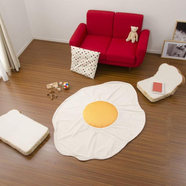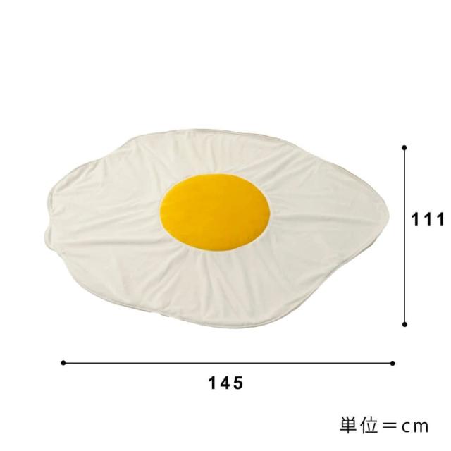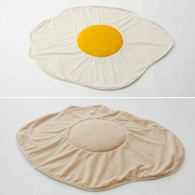 お部屋にほっこり癒しをプラスする、目玉焼きデザインのかわいいブランケットが登場!黄色い「黄身」部分はふっくら立体的で、見た目も手ざわりもやさしい仕上がり。まるで本物の目玉焼きのようなユニークさで、リビングや子ども部屋のアクセントにも最適です。