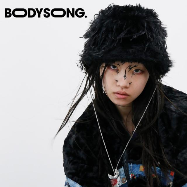 ボディソング BODYSONG. フェイクファーハット ウィッグ風 キャップ 帽子 ユニセックス 個性派 ファッション ブラック チェーンネックレス付き ストリート系 モード系 主役級アイテム 日本製 フリーサイズ おしゃれ コーディネートのアクセント 2025 春 夏 秋 冬 アート系