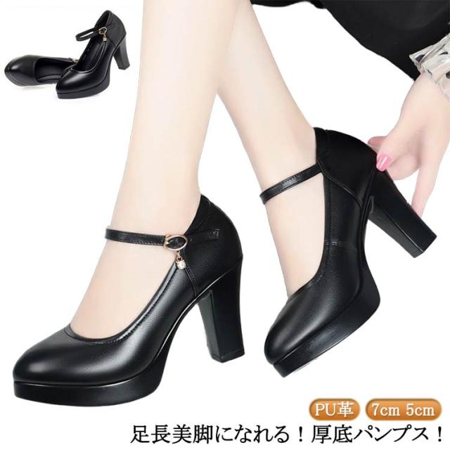 ハイヒール パンプス ストラップ 厚底 太ヒール 大きいサイズ パンプス PU革 歩きやすい ハイヒール 厚底 プラットフォーム レディース 通勤 冠婚葬祭 立ち仕事 靴 疲れない 7cm 5cm チャンキーヒール 黒 結婚式