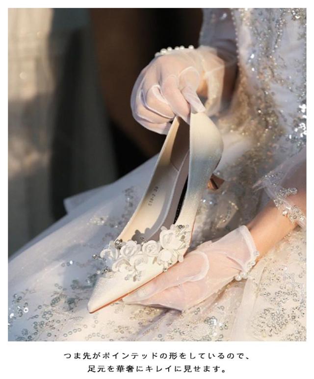 ブライダルシューズ 花モチーフ キラキラ ウエディングシューズ 5cmヒール ローヒール 結婚式 パンプス ポインテッドトゥ お花付き エレガント 優雅 韓国風 ウエディング シューズ ドレスシューズ 花嫁 靴 痛くない 疲れない 挙式 披露宴 発表会 演奏会 パーティー 純白