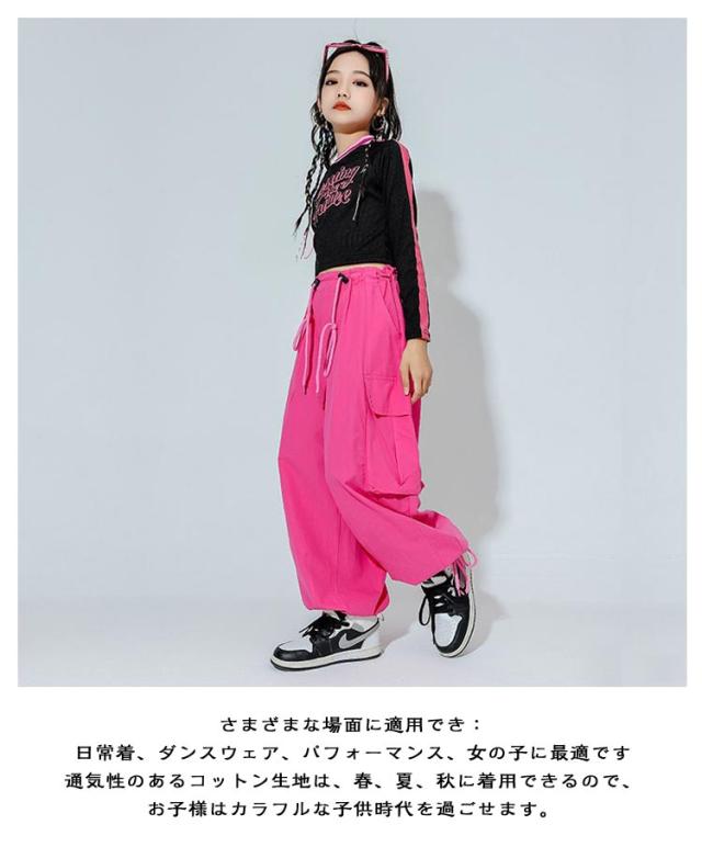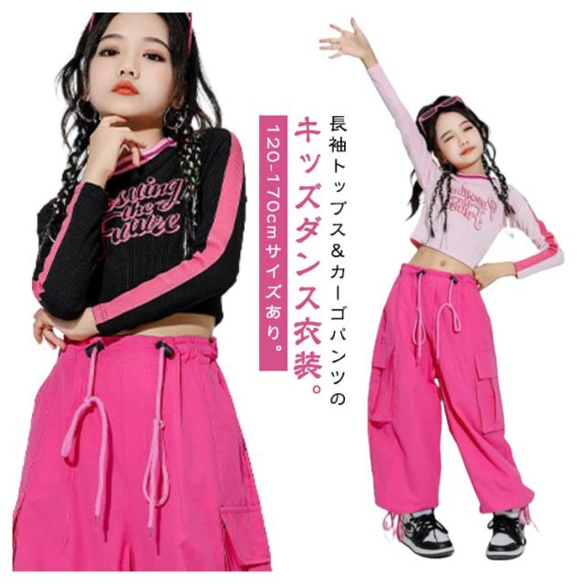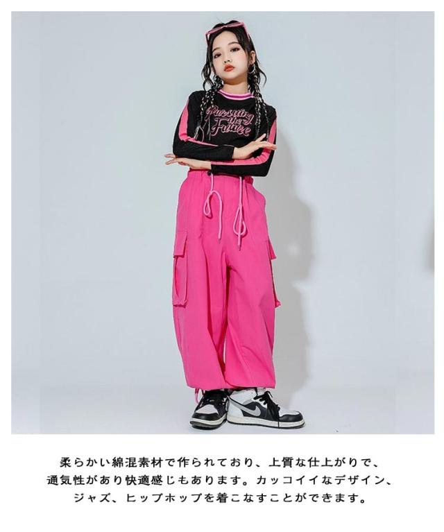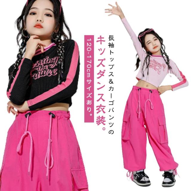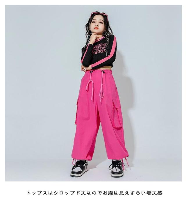 キッズ ダンス衣装 セットアップ 長袖 トップス へそ出し カーゴパンツ ワイドパンツ ドローコード付き ジョガーパンツ ダンスウェア ヒップホップ hiphop ジャズ K-POP 韓国 子供 女の子 ジュニア キッズ ダンス 衣装 普段着