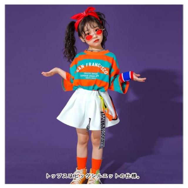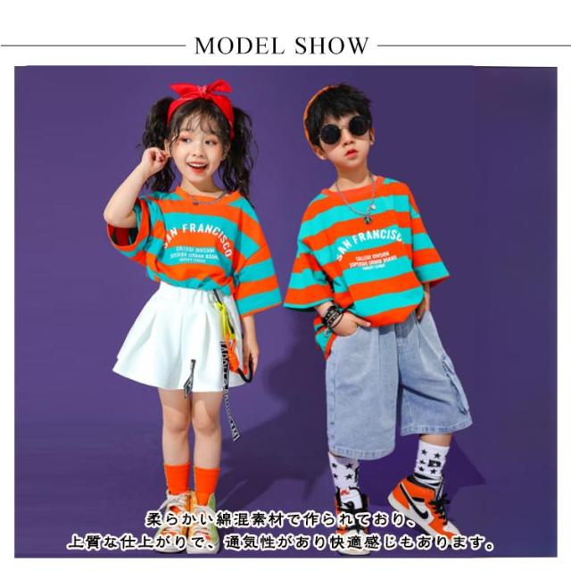 キッズ ダンス衣装 セットアップ 男の子 女の子 ダンス 練習着 子供 ダンス衣装 韓国 子供服 K-POP tシャツ 半袖 トップス デニムパンツ スカート 白 ショートパンツ ボーダー柄 ダンスウェア 体操服 チア チアガール 演出服 【送無】