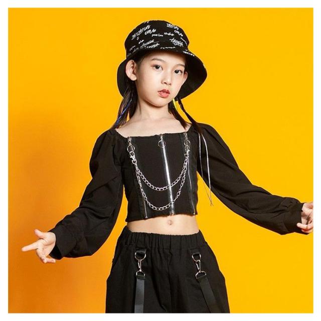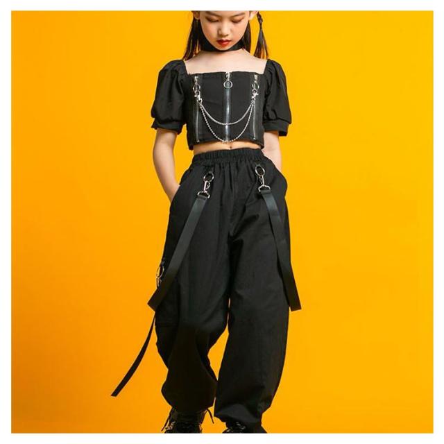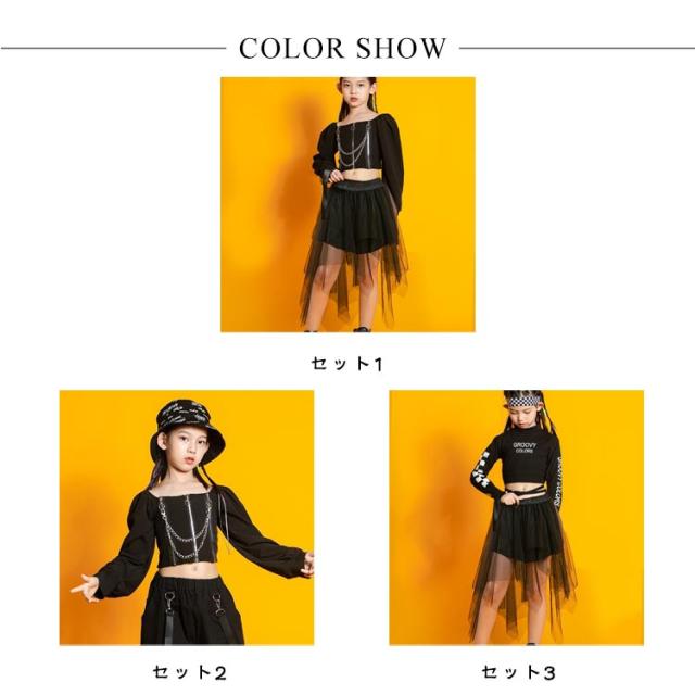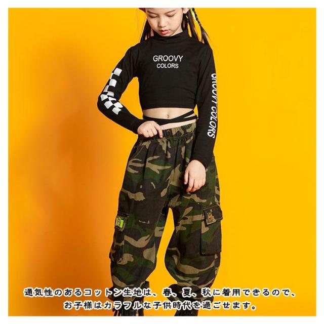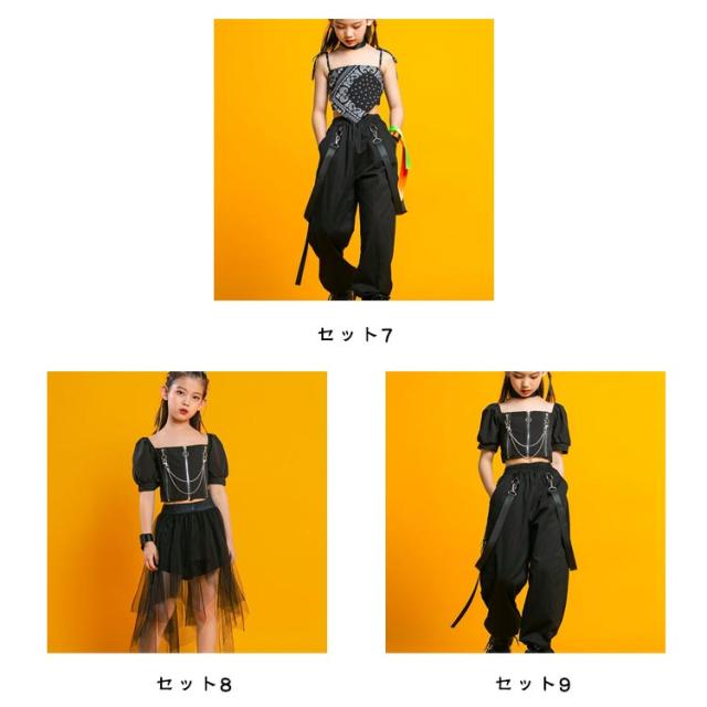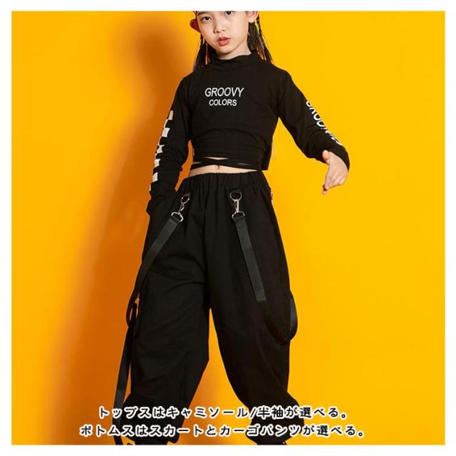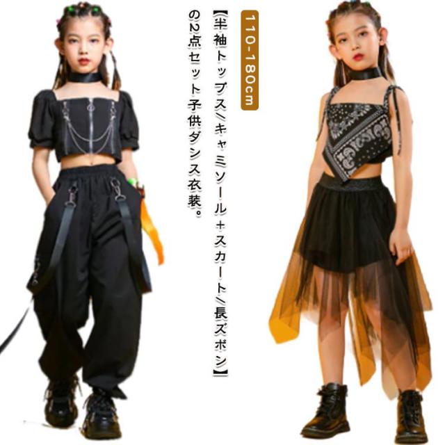 キッズ ダンス衣装 セットアップ 黒 ヒップホップ ジャズダンス 子供 女の子 ダンスウェア チュール スカート カーゴパンツ へそ出し トップス ペイズリー 肩出し 2点セット ジュニア ガールズ チアガール 演出服 ダンス 韓国 kpop