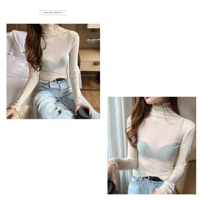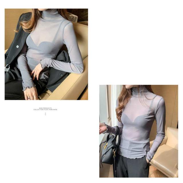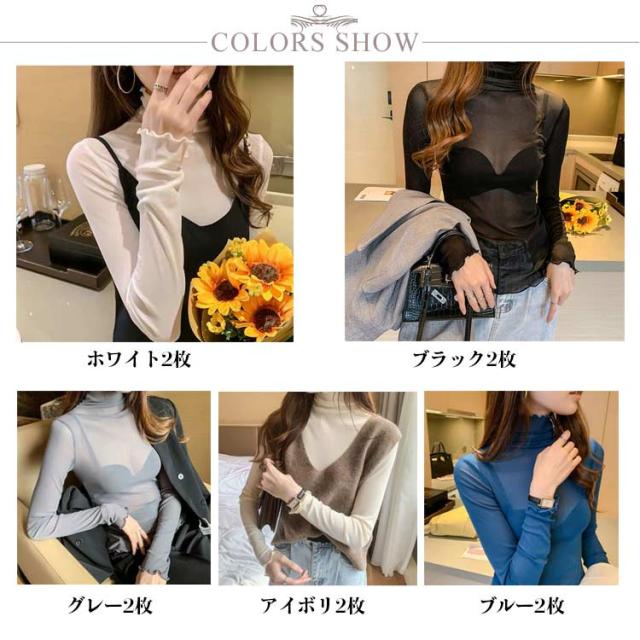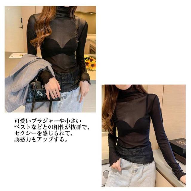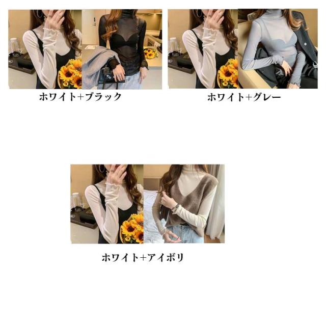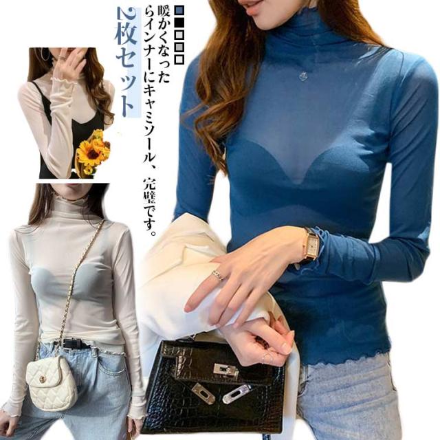 2枚セット チュール シースルー トップス Tシャツ インナー タートルネック コーデ レイヤード 長袖 薄手 重ね着 カットソー 春 夏 秋 透け感 おしゃれ