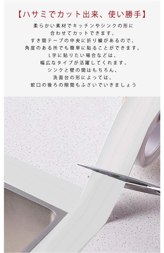 | 【隙間を守り、カビ防止】割れにくい防水防カビテープを貼るだけで、お掃除にくい隙間への水・汚れ・ゴミ・カビ・匂い等の難題を解消、お掃除は拭き取るだけですぐキレイになります。これからの梅雨季節には欠かせない一物です。浴室ドア、シリコンコーキング、洗面台、台所シンク等、水回りや床のひび割れの補修テープにも 【ハサミでカット出来、使い勝手】柔らかい素材でキッチンやシンクの形に合わせてカットできます。すき間テープの中央に折り線があるので、角度のある所でも簡単に貼ることができます。L字に貼りたい場合などは、幅広なタイプが活躍してくれます。シンクと壁の間はもちろん、洗面台の形によっては、蛇口の後ろの隙間もふさいでいきましょう 【粘着性抜群、剥ぐやすい】防カビテープ 補修テープは剥がした跡が残りにくい素材を使用しているため、繰り返し剥がしてものりが残らないです。金属製と木制の家具本来の姿をキープできます。台所コーナーテープ 隙間テープ キッチンテープは防油、耐熱、掃除が簡単、防カビ、防汚、防塵、防水、防湿、強力粘着、のりが残らず、交換もやすい というメリットがあります。 【適用範囲が広い】防カビテープは滑らかな表面で汚れのふき取りが簡単です。防カビテープは洗面台・調理台の継ぎ目・流し台・浴槽や便器と床の間に汚れが入っていくのを防止します。カビや汚れをブロックし、表面が汚れても洗剤で簡単に洗い落とせます。ご自宅の家具などを傷つける恐れを養生テープやコーナーガードとしてもご利用いただけます。掃除やメンテナンスが楽に。 | |