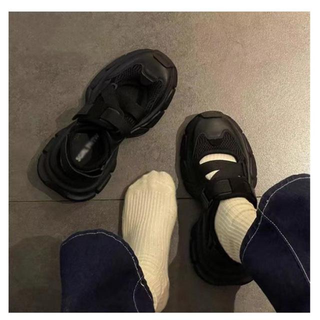 | 甲をぐるりと覆うベルクロデザインのメッシュスニーカーサンダル! 旬のボリュームのある厚底は履くだけでスタイルアップが叶う! | |