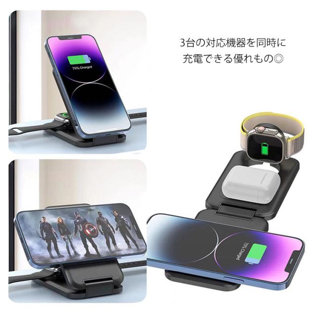 折りたたみ ワイヤレス充電器 3in1 ワイヤレス充電器 充電スタンド 3台同時充電 スマホ充電器 コンパクト