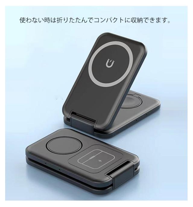 | ・3in1ワイヤレスチャージャー ・MagSafe対応でピタッと置くだけ ・3台の対応機器を同時に充電できる優れもの◎ ・使わない時は折りたたんでコンパクトに収納できます。 | |
