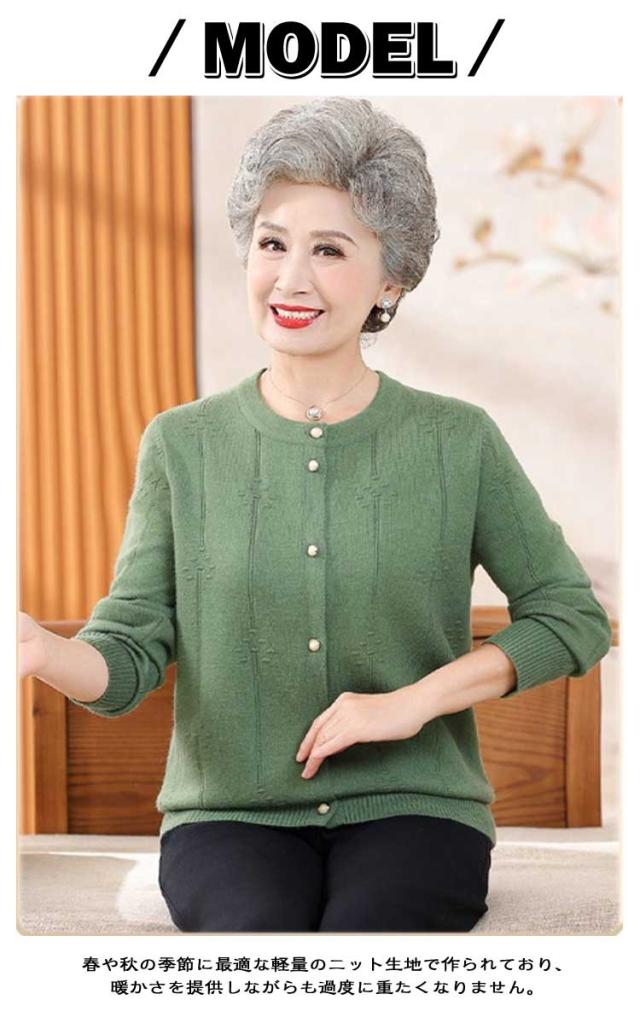 | 春や秋の季節に最適な高齢者向けのニットカーディガンです。【パールボタン】 春や秋の季節に最適な軽量のニット生地で作られており、暖かさを提供しながらも過度に重たくなりません。 身幅がゆったりしており、着心地が抜群です。 シンプルで使いやすいデザインは、どんなシーンにもマッチできます。 | |