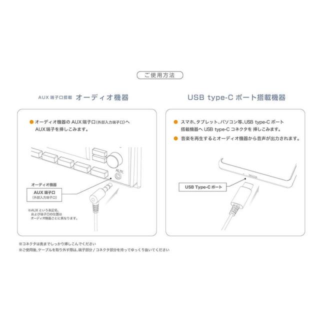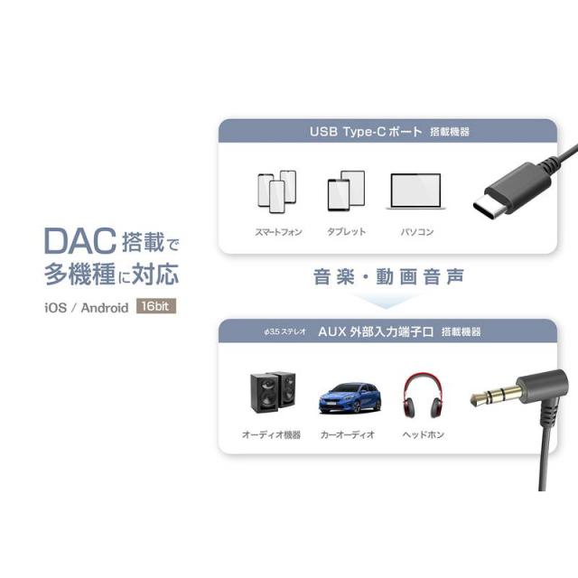 ●USB Type-C ポート搭載機器の音楽をAUX(外部入力端子口)搭載のカーオーディオ/オーディオ機器で本格サウンド再生するオーディオケーブル。