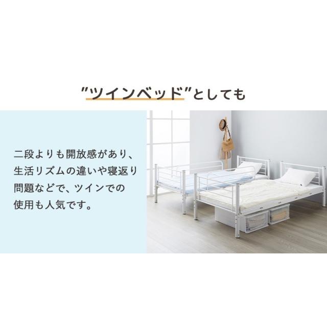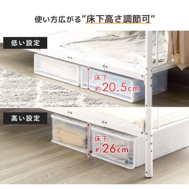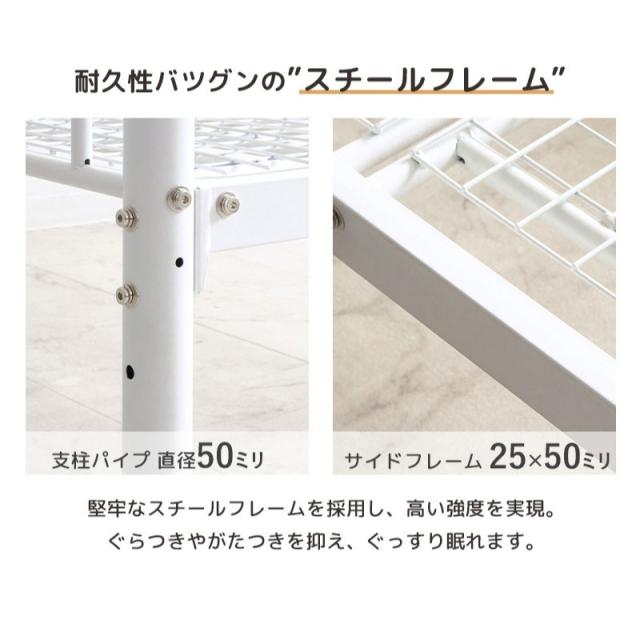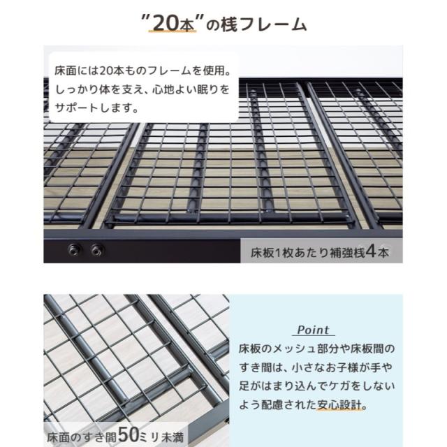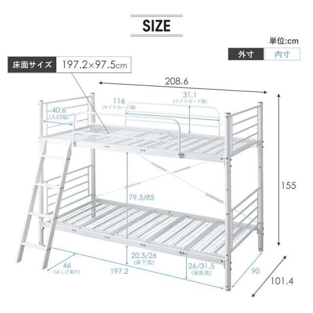 ■商品管理番号 IWB-2200 ■生産地 中国 ■サイズ [2段ベッド使用時] 本体:幅101.4×奥行208.6×高さ155cm 床面サイズ:97.5×197.2cm 床面高さ:26(20.5)/31.5(26)cm ※高さ2段階調節可/()内は床下有効内寸 [キングベッド使用時] 本体:幅205.3×奥行208.6×高さ70.5cm 床面サイズ:194.5×197.2cm [シングルベッド使用時] 本体:幅101.4×奥行208.6×高さ70.5cm ■素材 本体:スチール、粉体塗装 ■仕様 カラー:ブラック 本体重量:約71kg 耐荷重:床面約300kg 床面高さ2段階調整可 通気性抜群のメッシュ床板 フレームの強度を高めた揺れの少ない頑丈設計 床板のすき間を狭くし安全面に配慮 梱包サイズ1:118×40×20cm/約45kg 梱包サイズ2:98×39×27cm/約30kg お客様組み立て品(組立目安時間:2人約100分) ※こちらの商品は2梱包でお届けします。 ※お客様組立て品につきましては、組み立て後に不良の連絡をされても対応ができません。組み立て前にパーツに不良・傷等がないか、必ずご確認下さいますようよろしくお願い申し上げます。 ※記載は商品仕様の一部です。仕様説明不足等の理由での返品はできません。特に適合等は必ずご確認ください。