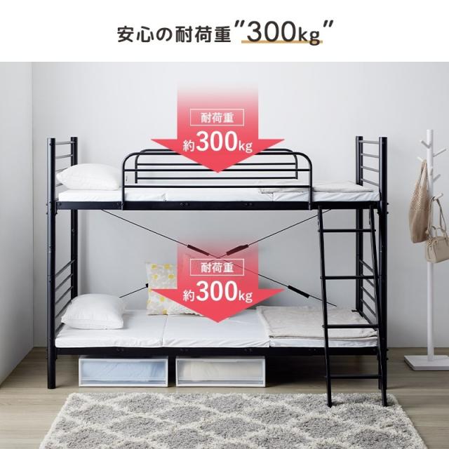 シンプルなデザインが、どんなお部屋にも合う二段ベッドです。大人でも安心して使用できる、各段の耐荷重は300kg。上下分割が可能で、それぞれがシングルベッドとして、連結すればキングベッドとしても使用できます。大人、子供、学生寮など、幅広い年齢層やシーンに対応可能です。