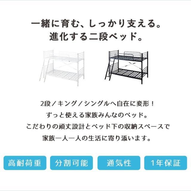 シンプルなデザインが、どんなお部屋にも合う二段ベッドです。大人でも安心して使用できる、各段の耐荷重は300kg。上下分割が可能で、それぞれがシングルベッドとして、連結すればキングベッドとしても使用できます。大人、子供、学生寮など、幅広い年齢層やシーンに対応可能です。