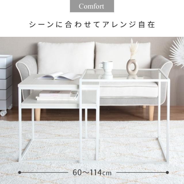 美しいガラス天板のテーブルと棚付き木製テーブルは重ねたり切り離したり、自由なレイアウトが可能です。
