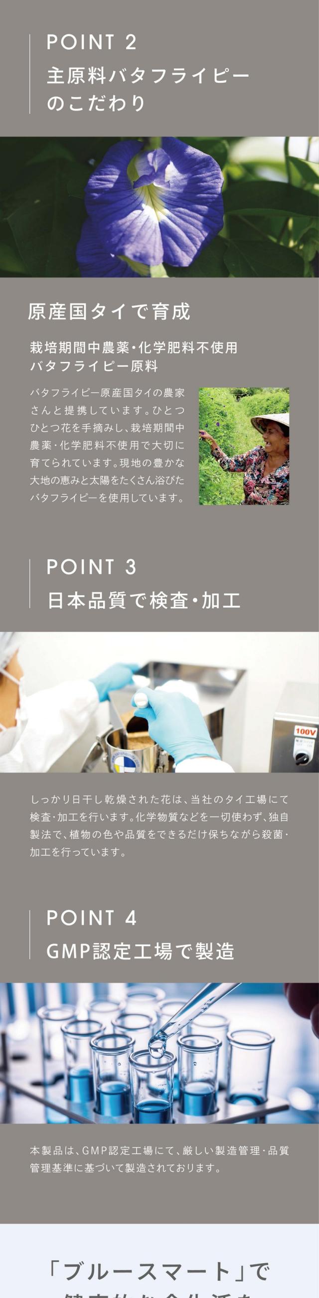 ぶどう糖(国内製造)、バタフライピーエキス、寒天/ゲル化剤(増粘多糖類)、酸味料、香料、甘味料(スクラロース)、酸化防止剤(ビタミンC)