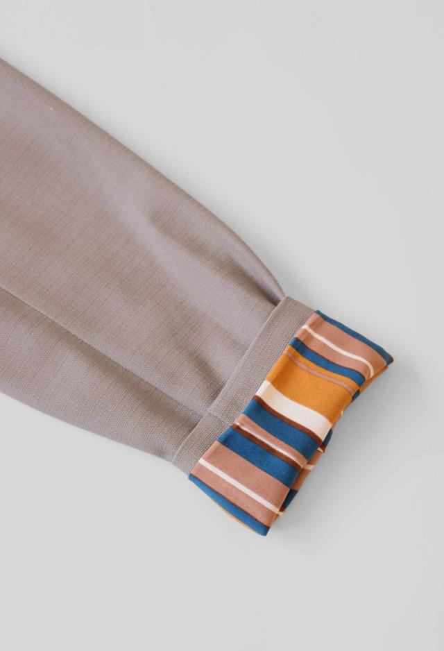 袖を折り返すと現れるストライプ柄が、シンプルな中にさりげないアクセントを加えます。
