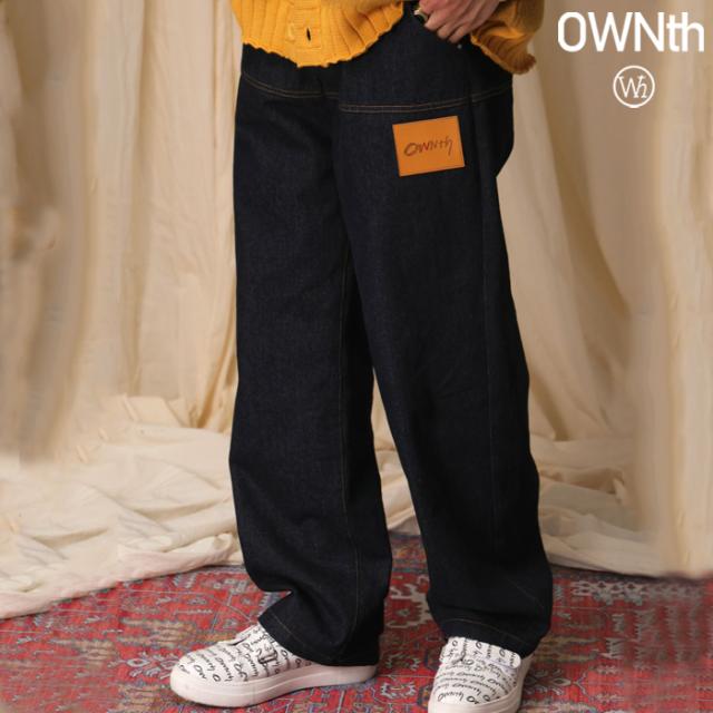 owt-0093z ワイドデニム ジーンズ 体型カバー 濃紺 ストリート カジュアル リラックス 着回し 脚長効果 革パッチ ダブルステッチ 綿 綿100 ナチュラル 刻印 ポケット付き