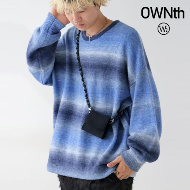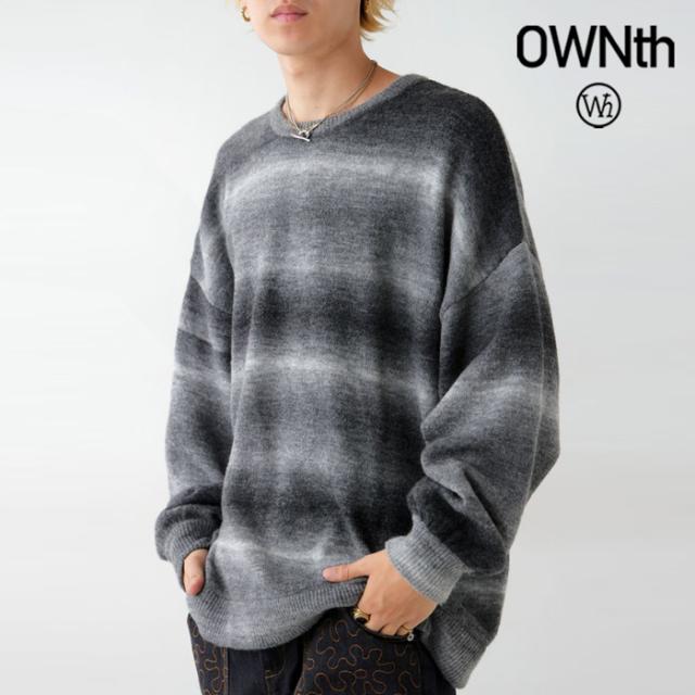 トップス全体に走るボーダー柄のグラデーションが目を惹くセーターで、1枚で主役になる存在感。