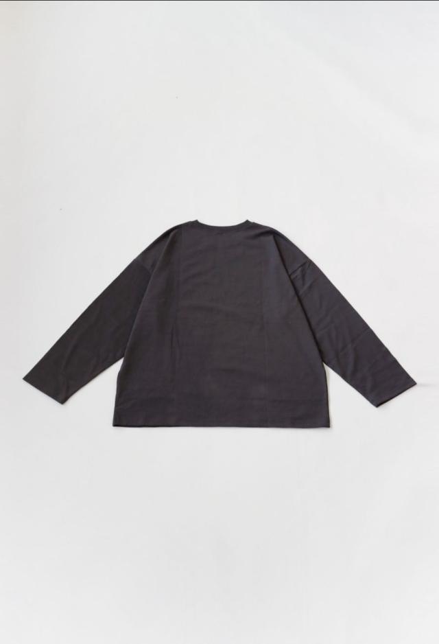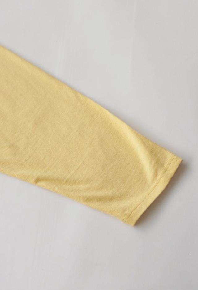 ネックラインはクルーネックで首まわりをすっきりと整え、袖丈は手元を自然にカバーする長さに設計。