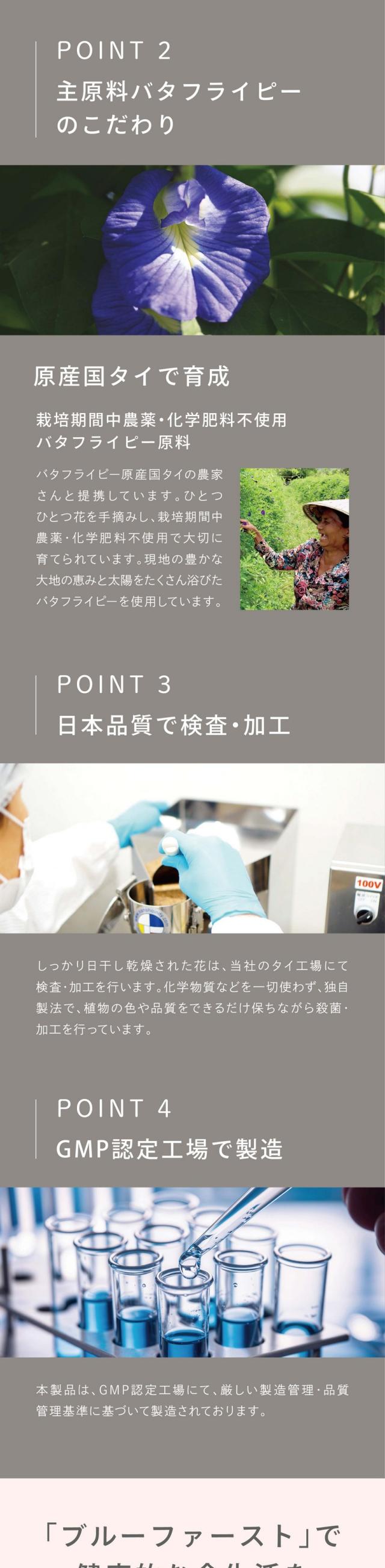 ●原材料名:バタフライピー粉末(タイ製造)、澱粉/結晶セルロース、ステアリン酸カルシウム、微粒二酸化ケイ素