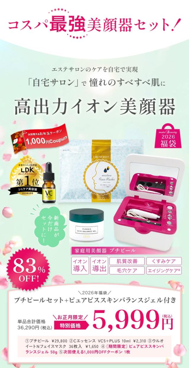 期間限定 家庭用美顔器 プチピール 福袋 petit peel イオン導入 イオン導出 VC5+PLUS10ml ビタミンC美容液 マスク エイジング 毛穴 くすみ 肌質改善 パック 福袋 セラム