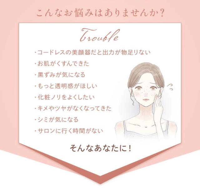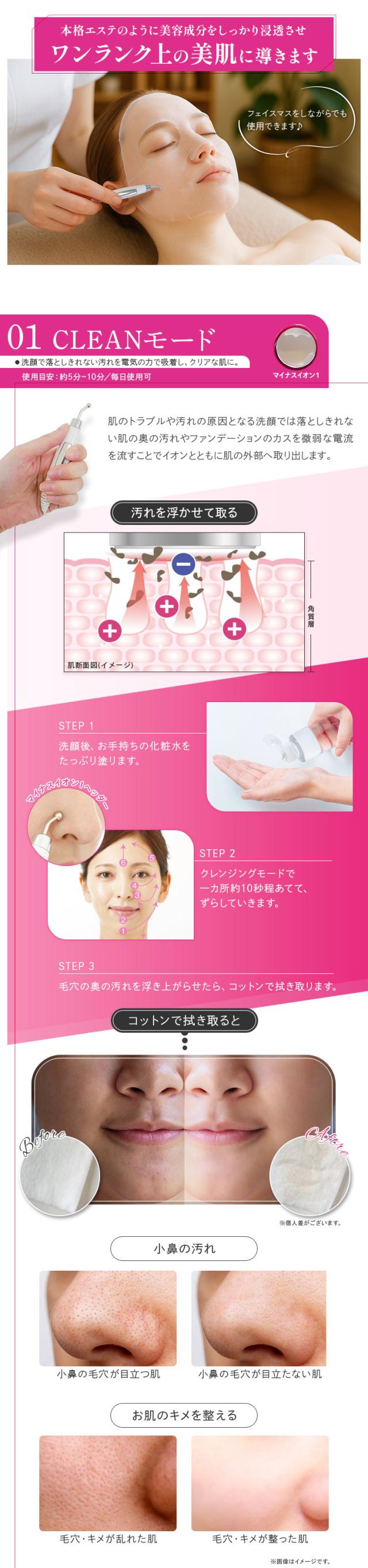 肌のトラブルや汚れの原因となる、洗顔では落としきれない肌の奥の汚れやファンデーションのカスを微弱な電流を流すことでイオンとともに肌の外部に取り出します。