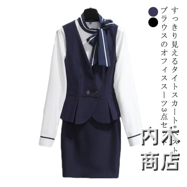 新登場 多機能デザイン レディース オフィスウェア オフィスベストスーツ 通勤 オフィス 家中時間充実化 飲食店 ブラウス+ベスト+スカート 女性 全2色 制服 3点セット 受付 長袖 SNS話題 スーツ ユニフォーム サービス業 事務 ホテル 企業