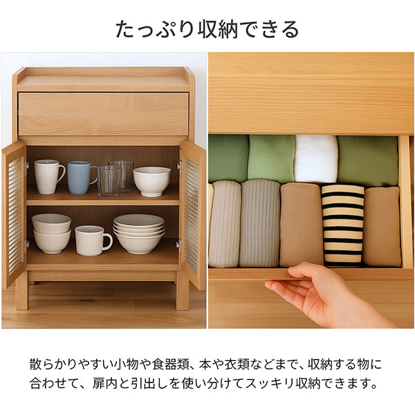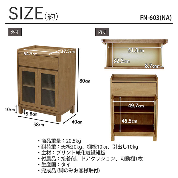 ・商品サイズ(約):幅58×奥行40×高さ80cm ・内寸(約):天板内寸/幅54.5×奥行36cm ドア間口/幅49.7×高さ45.5cm 棚板/幅54.5×奥行36×厚み1.8cm 引出し内寸/幅51.3×奥行32.6×高さ8.7cm ・脚サイズ(約):10cm、床からの脚フレームまでのサイズ(約):5.8cm ・商品重量(約):20.5kg ・耐荷重(約):天板20kg、棚板10kg、引出し10kg ・主材:本体/プリント紙化粧繊維板、ガラス ・付属品:接着剤、ドアクッション、可動棚1枚 ・生産国:タイ ・完成品(脚のみお客様取付) ※モニターの発色具合により、実際の色と異なる場合がございます。 |