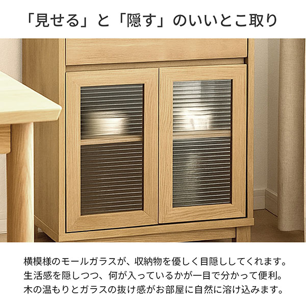 収納棚 扉付き (約)60cm幅 完成品 日本製木目シート おしゃれ 小さい キャビネット 引き出し ガラス扉 サイドテーブル 食器棚 ソファ横 幅58cm 奥行40cm 高さ80cm コンパクト 木製 モールガラス 高さが変えられる棚 物が落ちにくい天板 木目調 ナチュラル 脚を取り付けるだけ