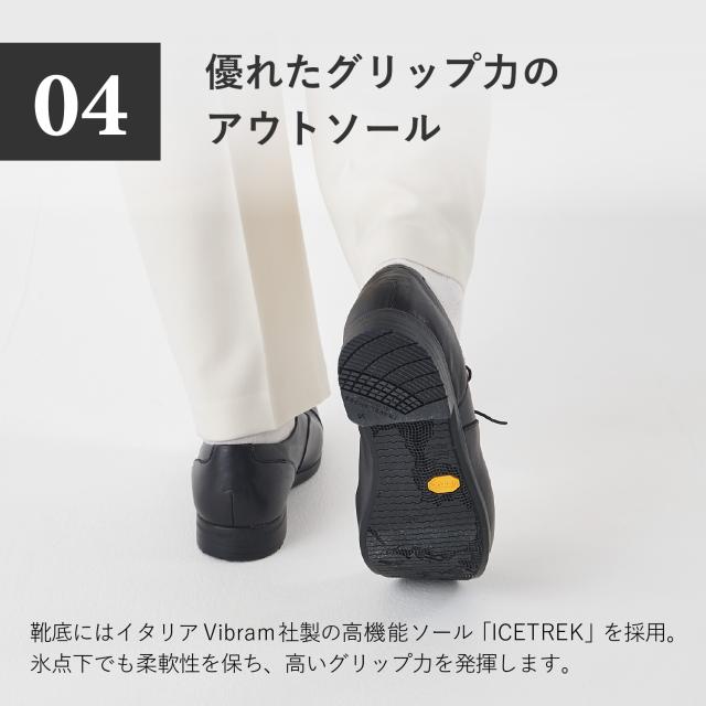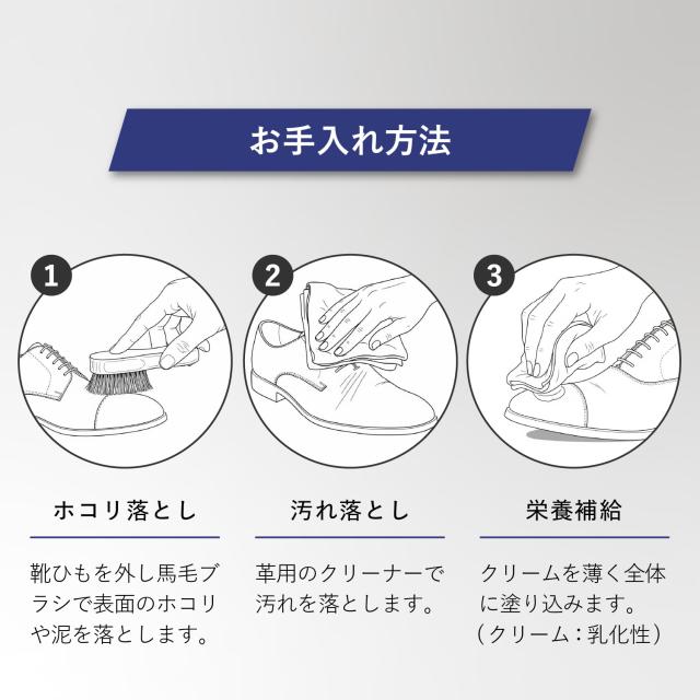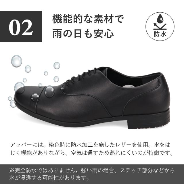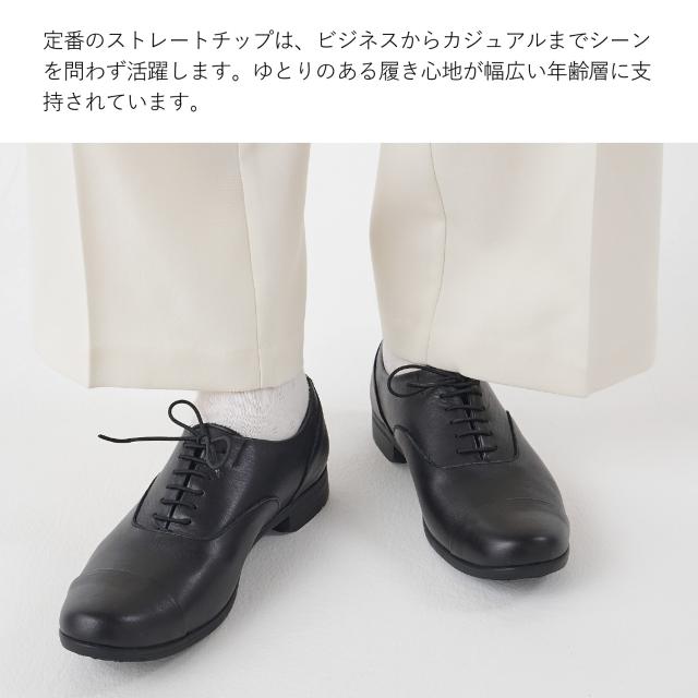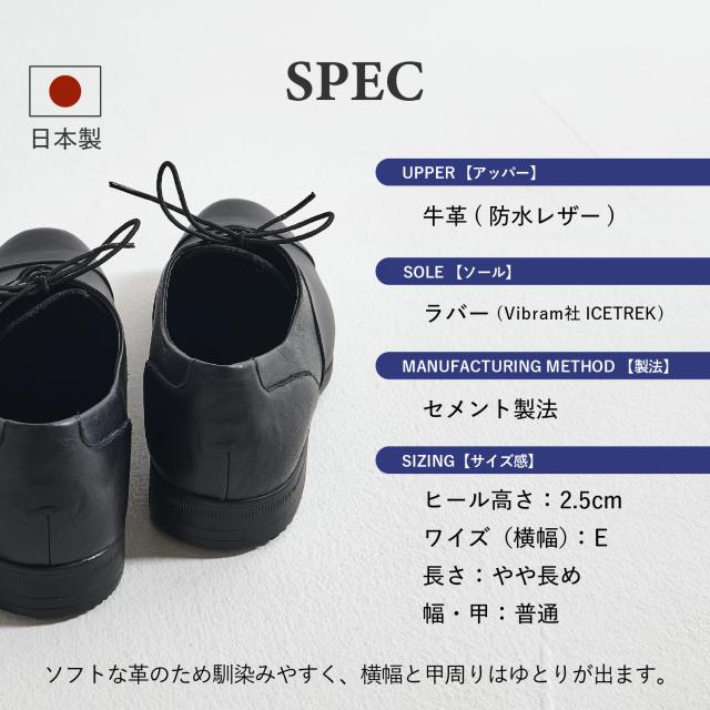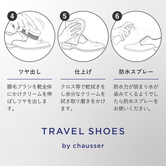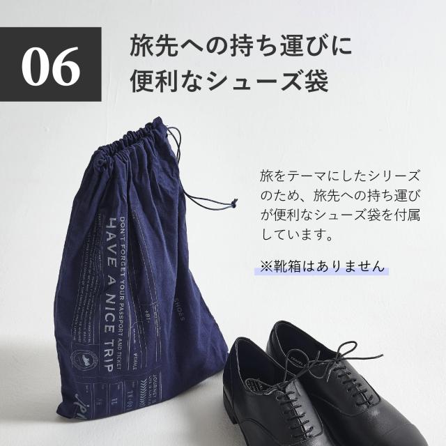 快適な履き心地でありながら、きちっと感を演出できるスタイリッシュなデザインです。TRAVEL SHOESのストレートチップレースアップシューズはビジネスからカジュアルまでシーンを問わず着用できる汎用性の高さや豊富な色展開が幅広い年齢層に支持されています。TRAVEL SHOESは旅をテーマにしたシリーズのため、旅先への持ち運びが便利なシューズ袋を付属しています。Leather:染色時からフッ素樹脂を革の繊維にからませ、革の表面にも防水加工を施したソフトな風合いの革を使用しています。水をはじいて空気は通すため通気性は保たれます。※完全防水ではございません。強い雨の場合はアッパーのステッチなどから水が浸透する可能性があります。Shoelace:ゴム紐を使用しているため、紐を解かずに脱ぎ履きが可能です。Insole:低反発特殊ウレタンを使用しているため、歩行時の耐圧をゆっくりと包み込み衝撃を軽減します。Outsole:イタリアVibram社の中でグリップ性の高い配合であるICETREK(アイストレック)を採用しています。
